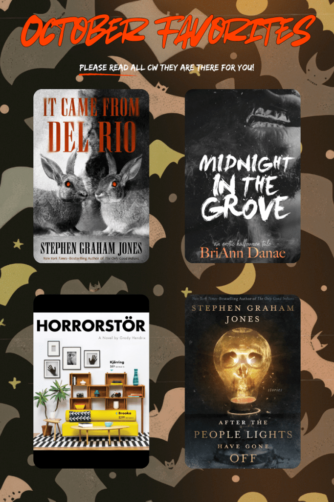 I am back with my October faves recap! I had quite a time with SGJ as you can see. Since reading Only the Good Indians last month, I have picked up more of his books. I think, from what I’ve read, folks either love his style or they hate it. I am on the love side of things. It’s kinda comforting honestly, to see an author do what the farquad they want I adored It Came From Del Rio immensely, It was compact, dark, and sad as shit. I loved it. The short stories?! I have something to say about them individually, but I’ll save that for another time, y’all.